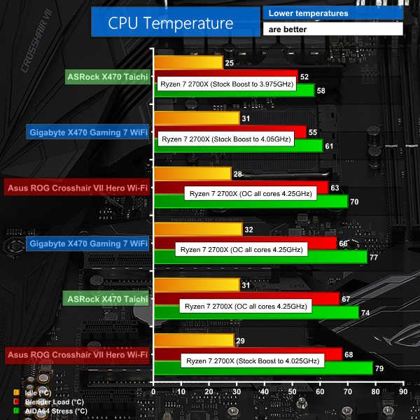 With the BIOS on Auto we were unimpressed by the high power draw. While Auto delivered high performance for a CPU running at ‘stock’ clocks we’re only talking about an extra two percent compared to ASRock X470 Taichi or Gigabyte X470 Aorus Gaming 7. That is a minor difference, however it gives Asus the right to boast about having ‘the highest performance out of the box’ (should they care to make that claim).