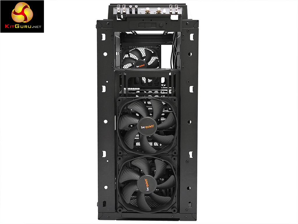 Building the test system inside this case is fairly straightforward, especially when you remove the top and front panels to give full access. We were keen to make use of the three 140mm Silent Wings 3 fans as they are excellent but also wanted to push the Dark Base Pro 900 to the limit so chose a Fractal Design Kelvin S36 with 360mm radiator which slipped in the top of the case quite easily once the optical drive bay was removed.