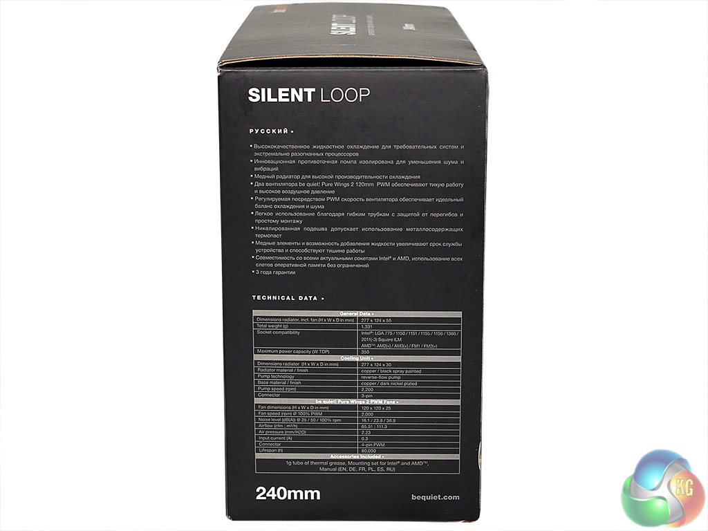 Silent Loop comes in three sizes. This 240mm model has a 30mm radiator thickness and is supplied with two 120mm be quiet! Pure Wings 2 fans that gives the system a 350W cooling capacity. The 280mm version costs £129.99 and uses the same 30mm radiator core as the 240mm with an increased rating of 400W.