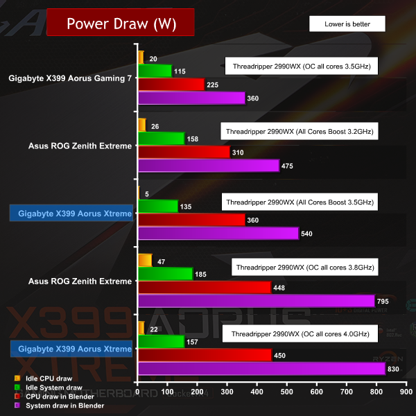 Asus ROG Zenith Extreme drew more power at 3.2GHz than the Gaming 7 did at 3.5GHz, but there was nothing special to report. On the other hand when the Asus was pushed to 3.8GHz the power figures climbed significantly with figures that were almost identical to the Gigabyte Xtreme at 4.0GHz.