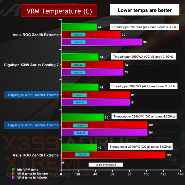 Our chart for VRM temperatures is ordered by the figure we saw in Blender, rather than AIDA64. The two Gigabyte boards operated at identical VRM temperatures in both tests, however the Asus ROG Zenith Extreme behaved quite differently.