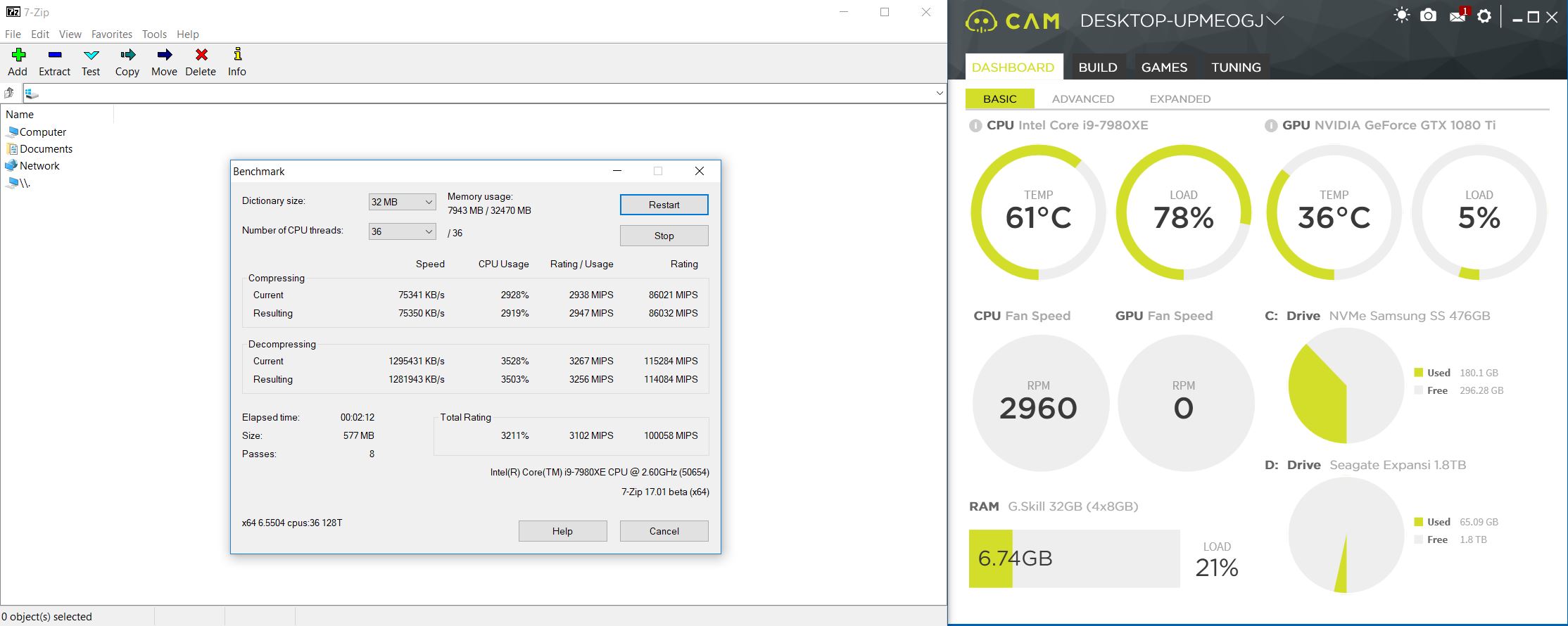 7-Zip is an open source Windows utility for manipulating archives. We measure the Total Rating performance using the built-in benchmark tool. The test stresses all CPU cores to 100% and shows an affinity for memory bandwidth.
