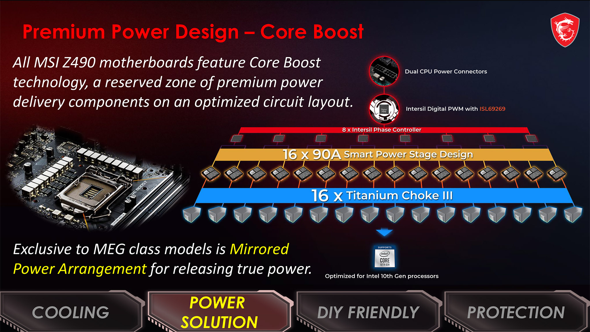 Once you have removed all those bits and pieces you can see the fundamentals of the MSI MEG Z490 Ace look sound. In particular the Intersil ISL69269 VRM controller and 16x ISL99390 90A power stages with doublers plus an extra stage for the SoC look purposeful. There are no graphics connectors on the rear I/O and as a result there is no power provision for the iGPU.