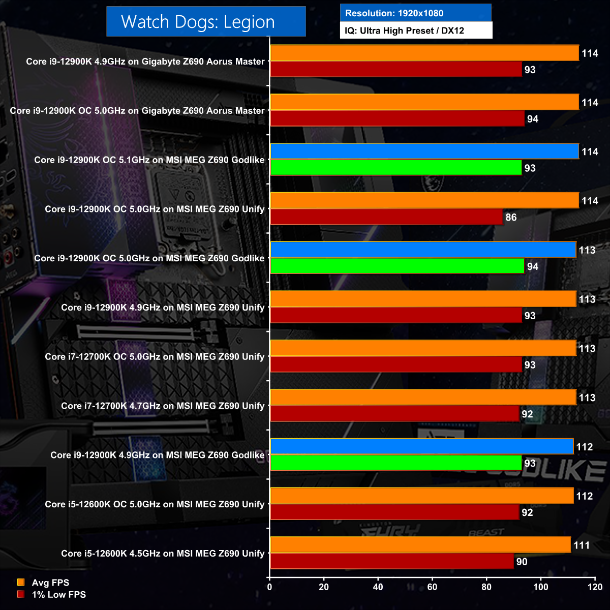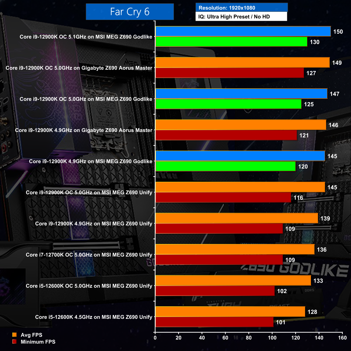 The Godlike's ability to overclock to 5.1GHz takes it directly to the top of the Far Cry 6 chart at 1080p.