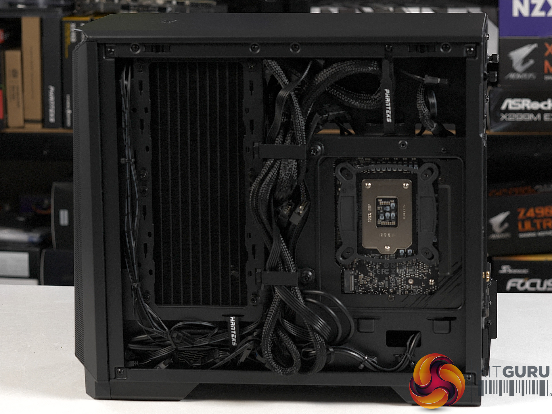 As you can see in our video, building a PC inside the Phanteks Eclipse P200A D-RGB is fairly straightforward, with just a little of the expected Mini-ITX fiddle. The ATX power supply lives in the roof and has unusual cable routing, however that presents no major problems. Your Mini-ITX/Mini-DTX motherboard sits in a recessed motherboard tray that is a very close fit. Our chosen Gigabyte Z590I Aorus Ultra motherboard uses adapters for the fans headers and USB 2.0 that required some careful routing to be sure we had plenty of room in the side location for the Phanteks 240mm AIO.