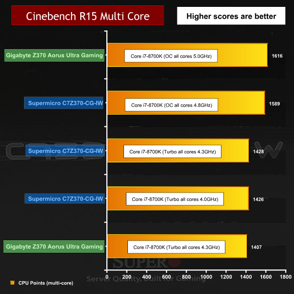 As we describe above, we ran the Core i7-8700K on the SuperO board at the restricted 95W setting with a 4.0GHz Turbo speed and also with the power limit raised to allow the Turbo to run at 4.3GHz. The final setting used the overclocked 4.8GHz profile in the BIOS.