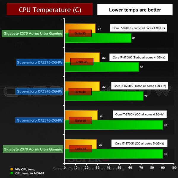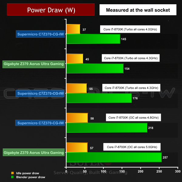 The power draw and temperature figures for the SuperO look unimpressive next to the Gigabyte. While it has to be said you can save a useful 40W running the i7-8700K at 4.8GHz rather than 5.0GHz, we also note the SuperO consumes 22W more than Gigabyte when both boards run the CPU at 4.3GHz.