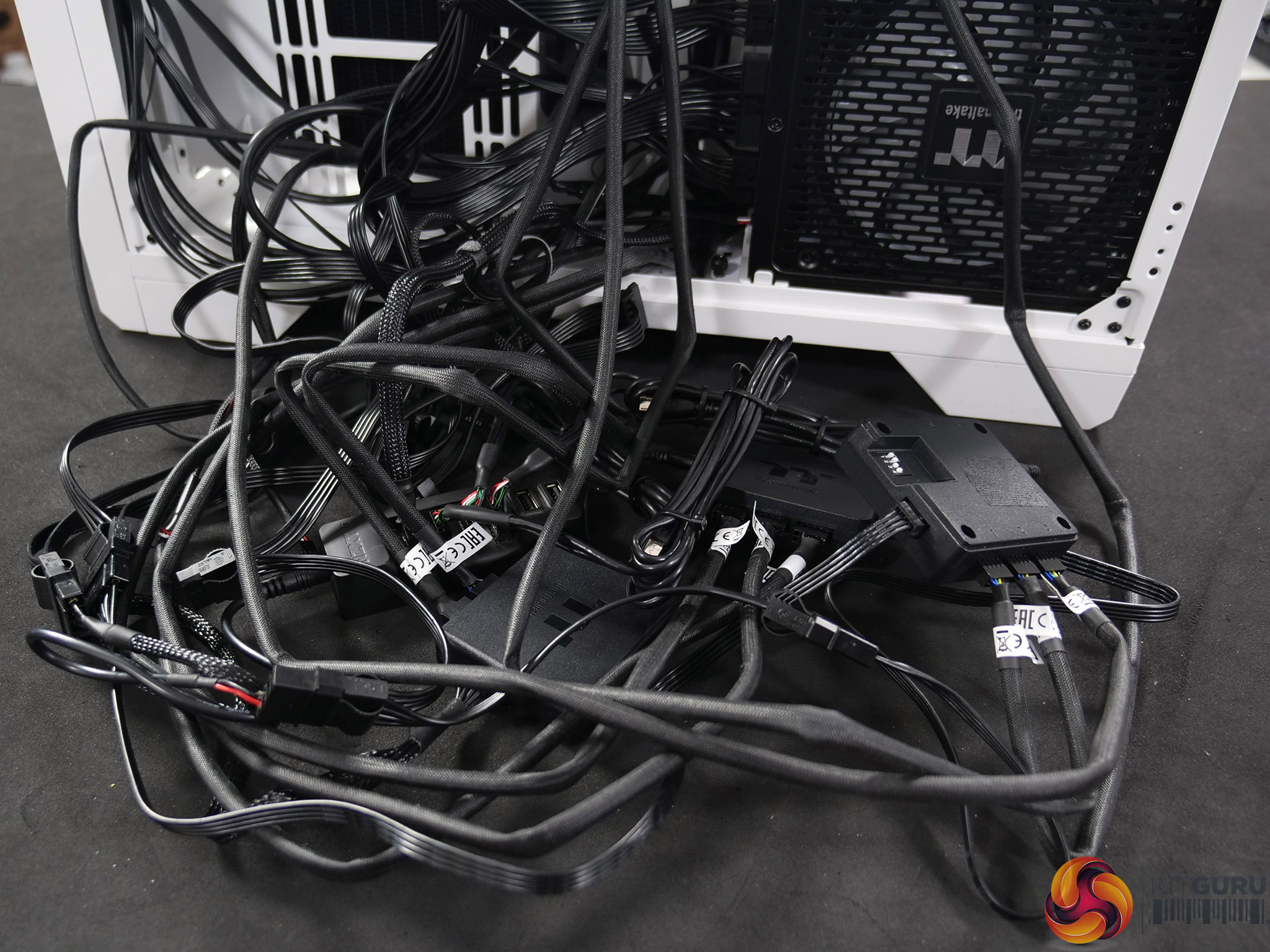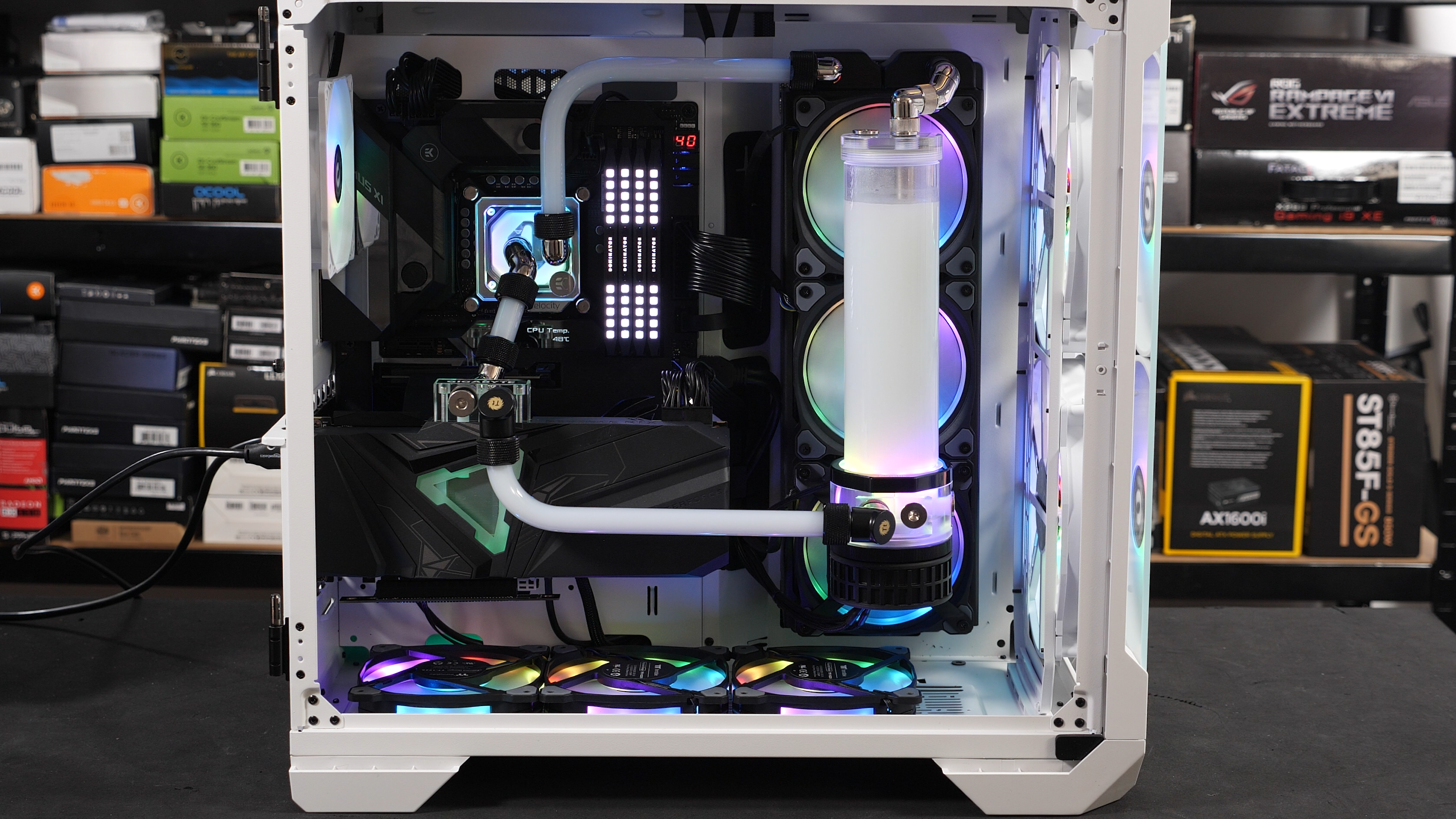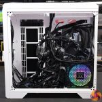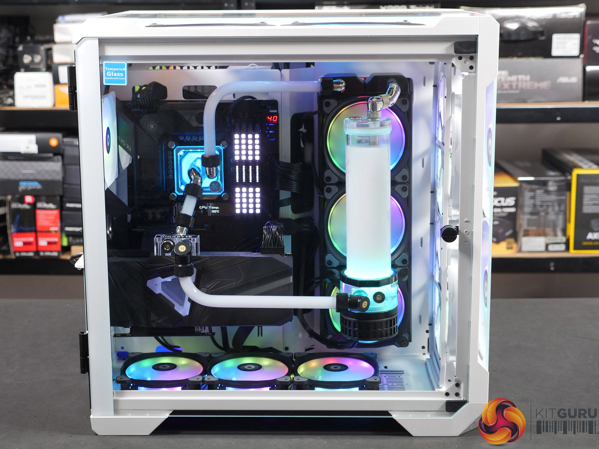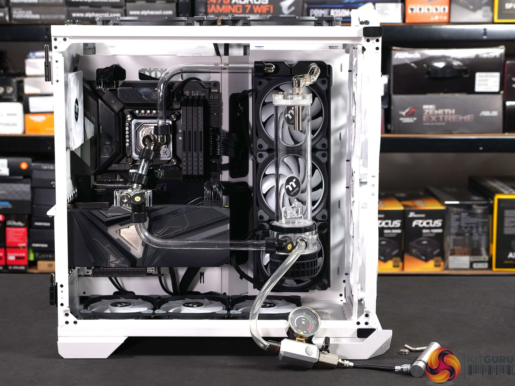 After more hours of work than we care to admit the PC was built, the custom loop was complete and the RGB was connected and configured. We had four RGB utilities on the go; Thermaltake RGB Plus, Gigabyte RGB Fusion 2.0 for the graphics card, Asus Aura Connect for the motherboard and connected EKWB parts and finally Corsair iCUE for the DDR4 RAM. We also had a huge pile of cabling to tuck away inside the back panel which is thankfully steel, rather than glass