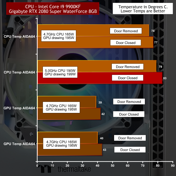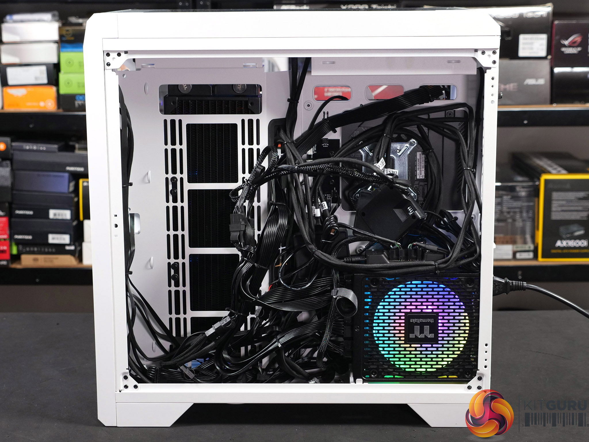 We are aware that having the intakes at the front and top with exhausts at the back and bottom might be controversial because, you know, hot air rises. We took this approach with our eyes open as the View 51 TG has plenty of space below the case and were confident the case would cool our hardware correctly. In fact the View 51 TG has so many vents it is almost an open structure and it makes very little difference whether the main glass door is open or closed. You can see the results in our graph as the Thermaltake View 51 TG did a fine job cooling 500W of combined load for CPU and GPU.
