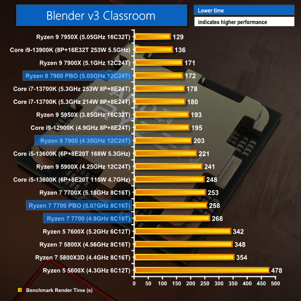 Looking at Blender Classroom, the stock Ryzen 9 7900 is well behind the 7900X thanks to its 750MHz frequency deficit. The 65W chip sits between a power unlimited Core i5-13600K and a Core i9-12900K.