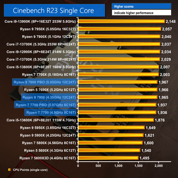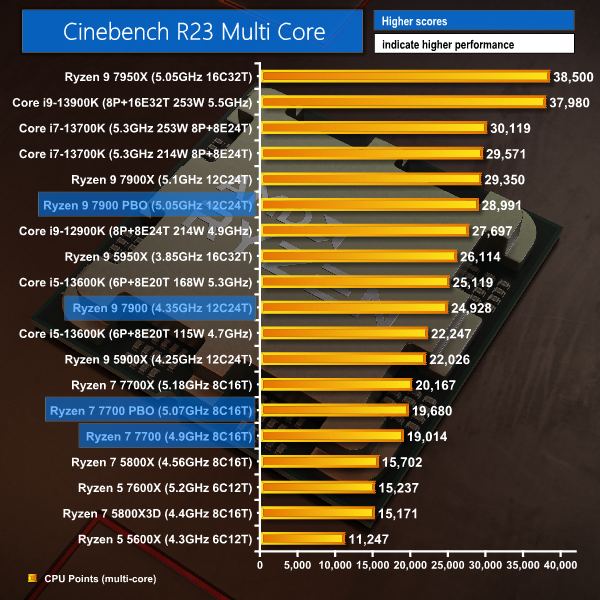 The Ryzen 9 7900 is comparable to a power unlimited Core i5-13600K but pushes close to the quick 7900X when overclocked via PBO. And the Ryzen 7 7700 is still well above the Zen 4 six-core and Zen 3 eight-core.