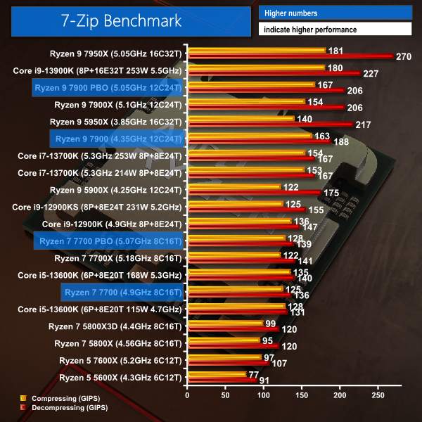 7-Zip compression performance has shown a sizable improvement on these new processors thanks to an AGESA and BIOS update on our test system. As such, the Ryzen 9 7900 appears better than the 7900X, which isn’t really the case.
