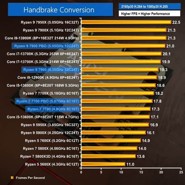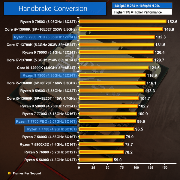 PBO overclocking actually pushes the Ryzen 9 7900 above the 7900X. This is realistically a reflection of BIOS and AGESA updates in our test data.