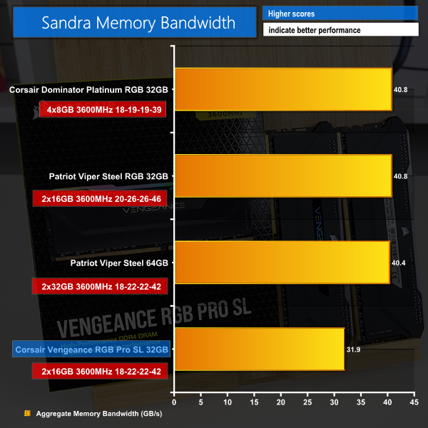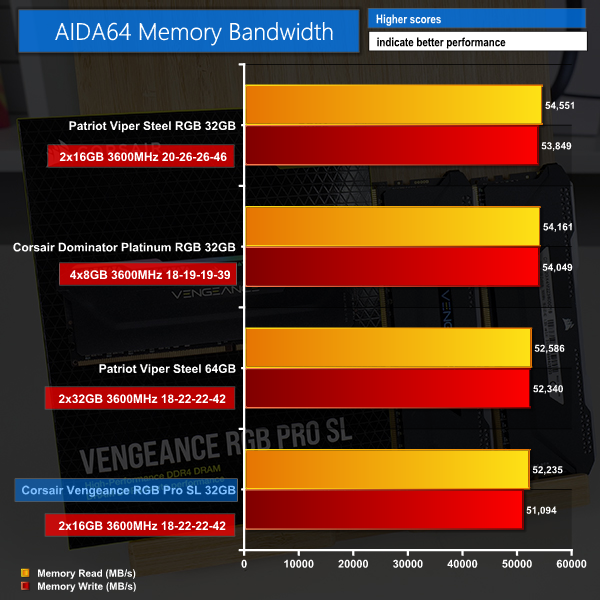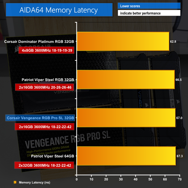 We see more of the same in the memory specific tests; despite offering technically tighter timings than the competing Patriot Viper Steel RGB kit, Corsair Vengeance RGB Pro SL modules are lacking in performance due to the single-rank configuration.