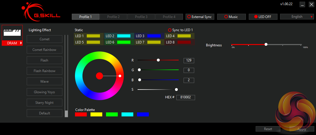 In terms of RGB synchronisation, G.SKILL does offer their own tool. It is actually reasonably comprehensive and allows individual control of the 8 LED zones. You can select a few different modes and then settings such as speed and brightness. And there is also support for Razer Chrome RGB sync.