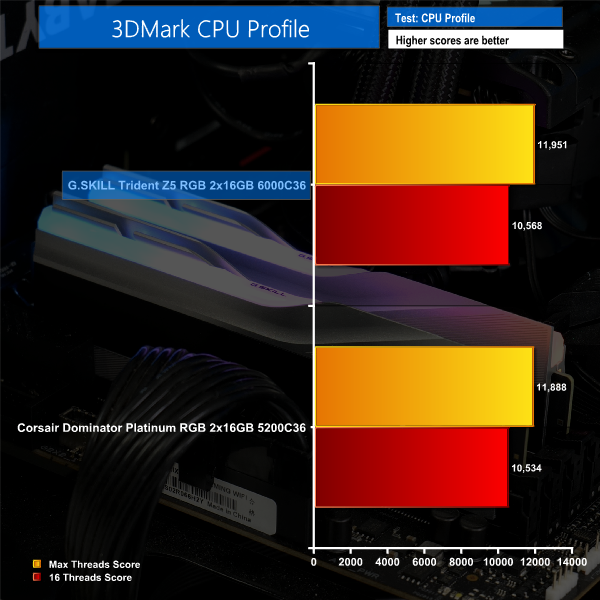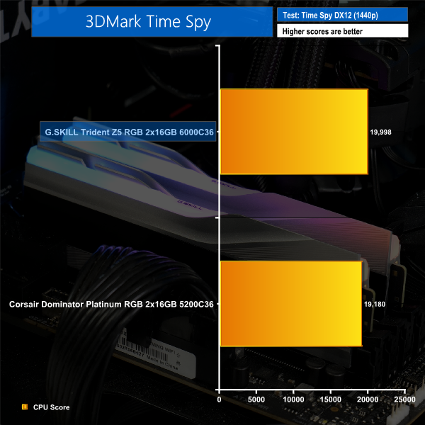 3DMark’s CPU profile test shows effectively no gain for the 6000MHz Trident Z5 RGB memory. The CPU scoring section of the Time Spy test is a little faster on G.SKILL’s higher-clocked sticks, though.