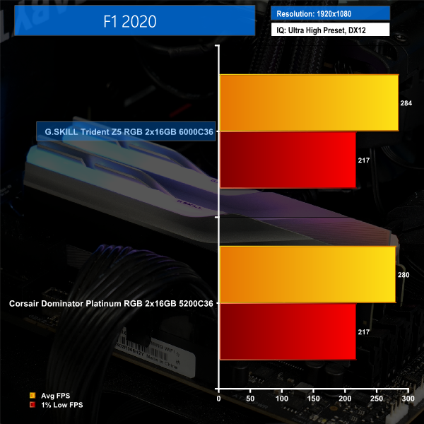 Now looking at 1080p gaming, we see F1 2020 delivering a small boost in frame rates for the faster G.SKILL kit. This performance uptick is minor, particularly at such lofty frame rates already.