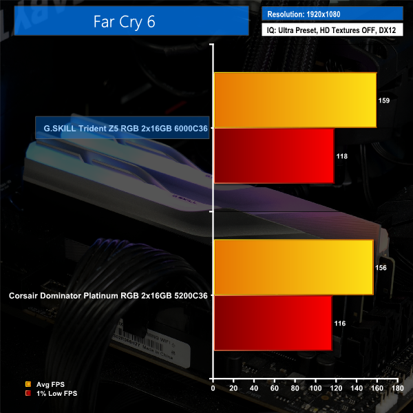 The 6000MHz Trident Z5 RGB set is also quicker in Far Cry 6, and this time, the performance increase may be a touch more important given the proximity to 120Hz/165Hz displays and the frame rate targets for such monitors.