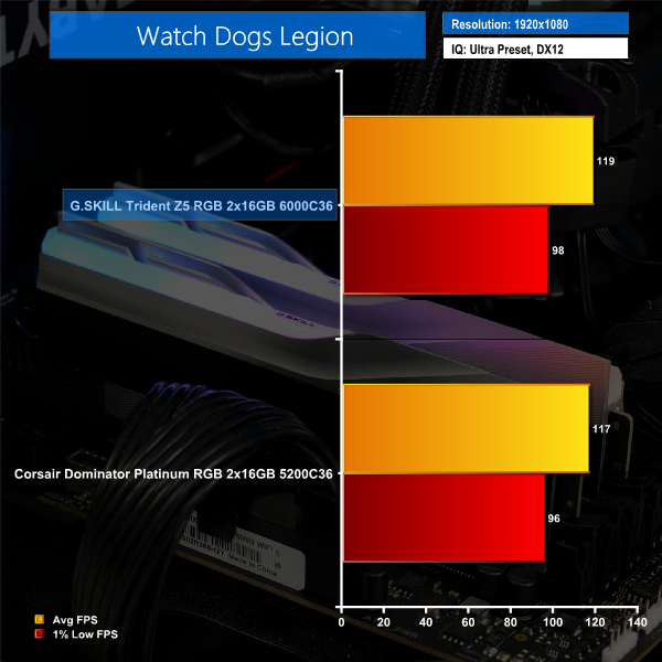 Watch Dogs Legion is also a couple of FPS quicker for G.SKILL on both the average and 1% low metrics.