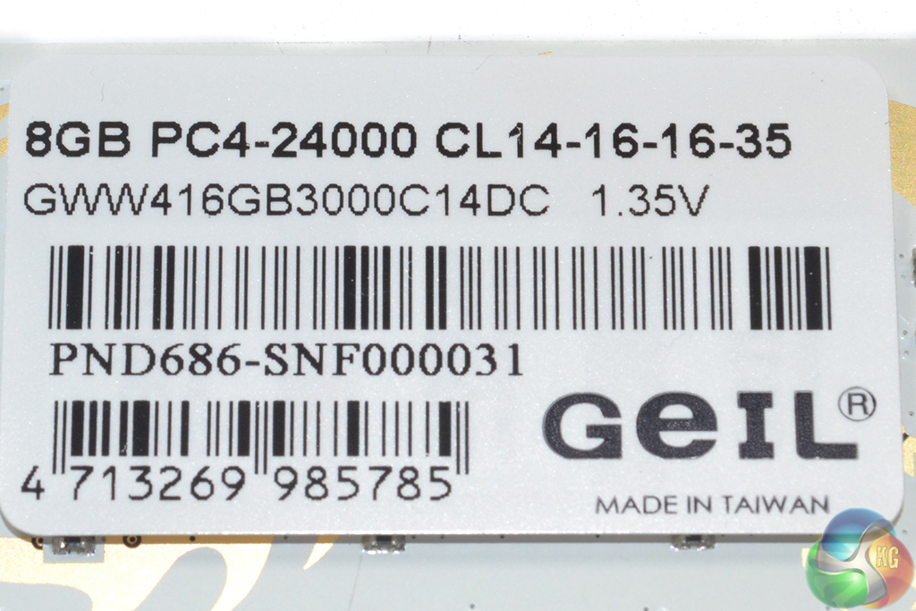 Eight memory chips on each side of the PCB form the 8GB capacity for each DIMM in our 16GB test kit. GeIL has informed us that the memory ICs are manufactured by SK Hynix. The GeIL CG4L512G88BA093L chip marking is in fact a sticker on top of the SK Hynix ICs.