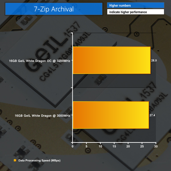 A 200MHz frequency increase from an already high-speed memory kit is good to see. The small frequency bump, without any change to the timings, results in small improvements for the Cinebench rendering and 7-Zip archival workloads.