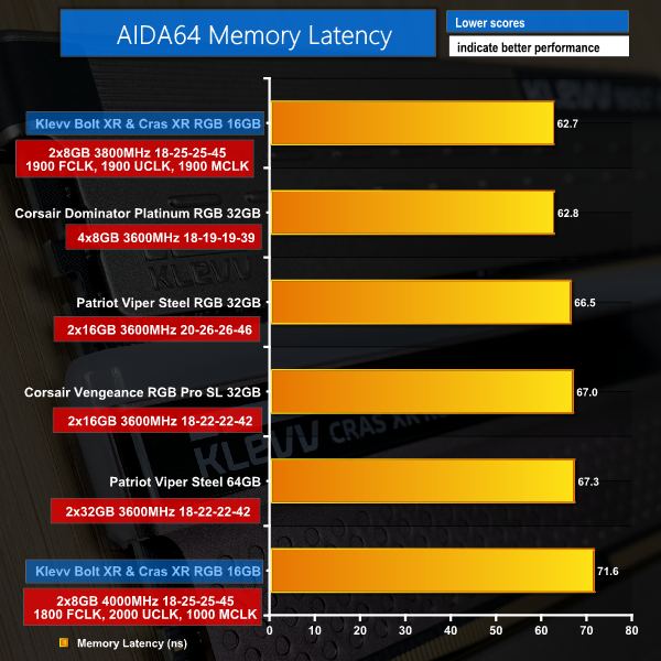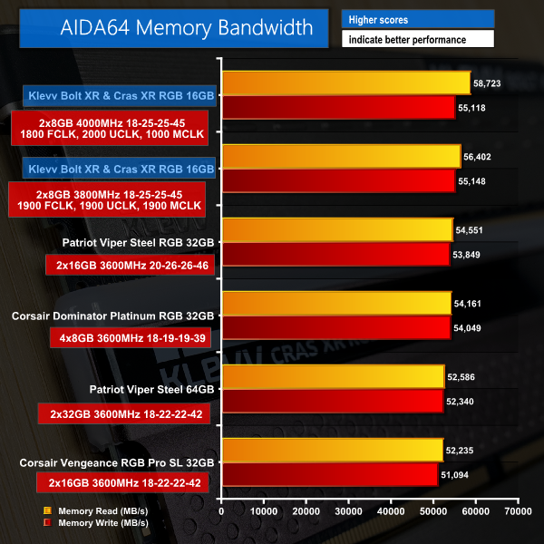 AIDA’s memory bandwidth test switches up the chart and this time has the Klevv kit at the chart top thanks to their higher operational DDR4 frequencies. This test does not seem to care for memory controller clock speed deficits.