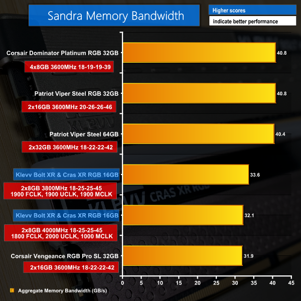 Raw memory bandwidth in Sandra prefers the 3800MHz mode as the 4000MHz configuration shows little improvement over Corsair 3600MHz sticks.