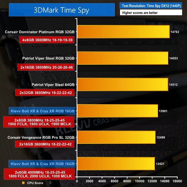 3DMark Time Spy continues the same trend that we saw from CPU-biased performance tests. The 3800MHz configuration proves beneficial and the 4000MHz setting with Klevv DDR4 is almost matching Corsair’s single-rank sticks.
