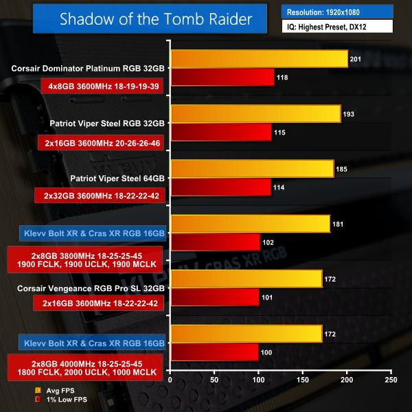 Shadow of the Tomb Raider shows this same trend, but the 4GHz memory mode for Klevv roughly matches the technically lower clock Corsair set.