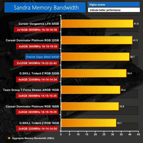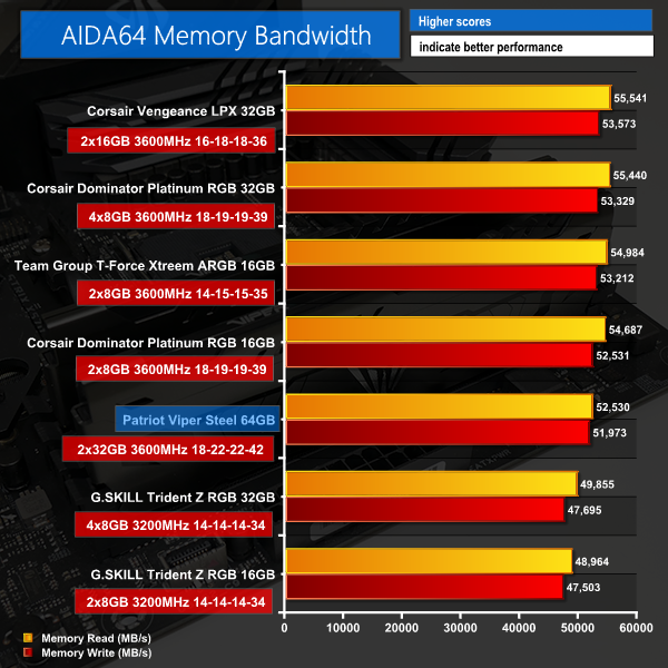 Memory bandwidth falls in line for 3600MHz DDR4 with a high-density IC configuration. Latency performance is unsurprisingly sat at the bottom of our chart given Patriot's comparably loose timings that are to be expected from 32GB DIMMs.