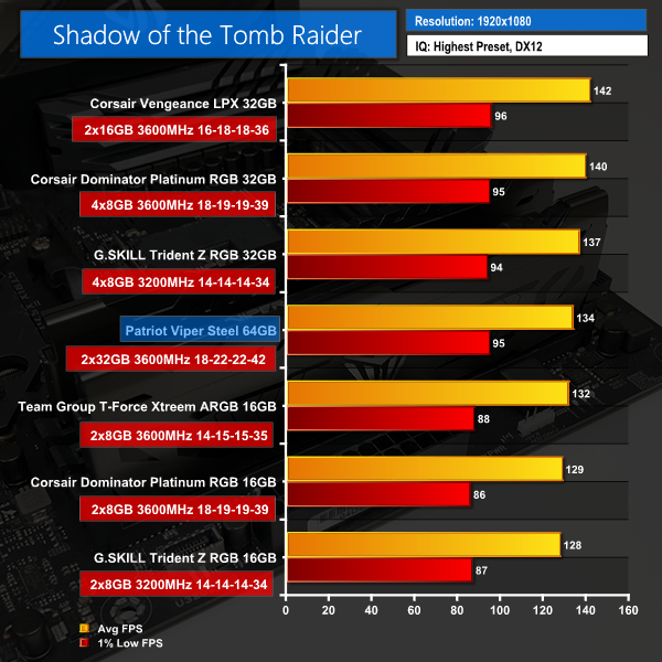 Gaming-related performance comes out reasonably. 3DMark Time Spy puts the 64GB Patriot set in the middle of our hierarchy, and we see the same positioning with Shadow of the Tomb Raider FPS numbers. A key benefit of the Patriot 64GB set in these scenarios is the spare capacity to handle significant background tasks.