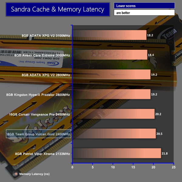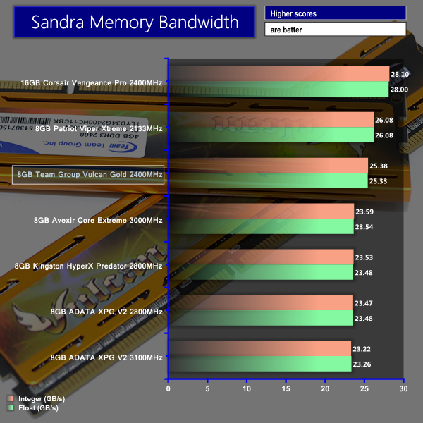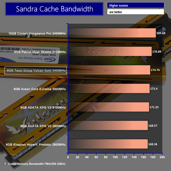 Team Group's 2400MHz CL11 RAM kit shows consistent performance in Sandra's set of memory-intensive benchmarks. Bandwidth numbers for the Vulcan Gold kit are slightly behind Patriot's lower latency 2133MHz set, although they are above those set by the high-frequency, loose timings Hynix-based overclocking kits.