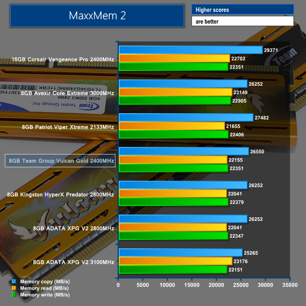 Team Group's 8GB 2400MHz kit puts up a mid-table performance for Maxxmem 2 bandwidth numbers. Latency performance is again trailing to the higher-speed kits, although Patriot's 2133MHz set, exhibiting a 5% performance deficit, cannot keep pace with the Vulcan modules.
