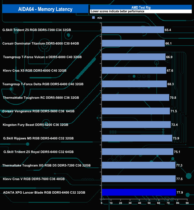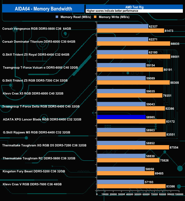 When tested with the AIDA64 memory benchmark the 32GB kit of XPG Lancer Blade RGB 6400 produced a read figure of 58,985MB/s a result which places the modules in the bottom half of the results chart. However, its write result of 83,172MB/s is the sixth fastest we have seen to date in this test on the AMD platform.