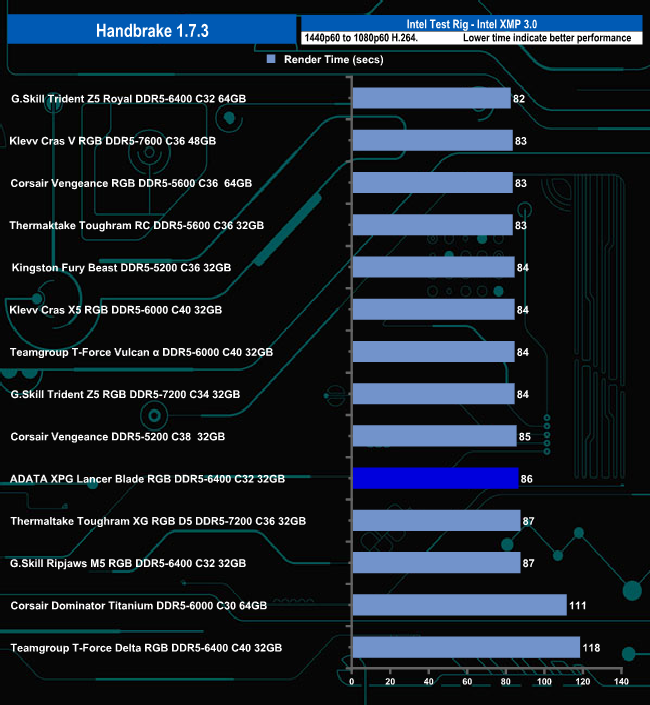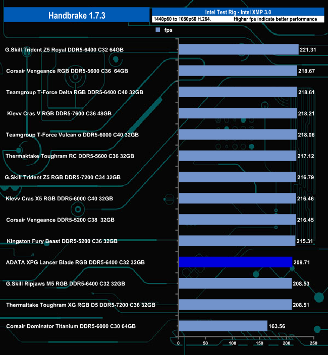 In the Handbrake test, the XPG Lancer Blade RGB 6400 sits just above G.Skill Ripjaws M5 RGB 6400 in the table, some 11.60fps behind the fastest modules we've seen to date, the Trident Z5 Royal 6400 from G.Skill.