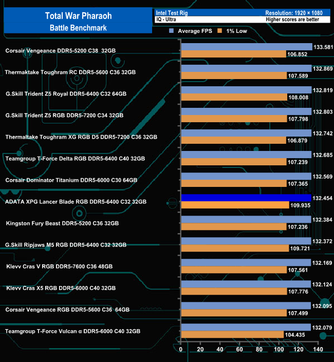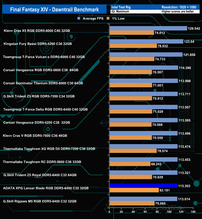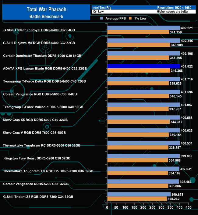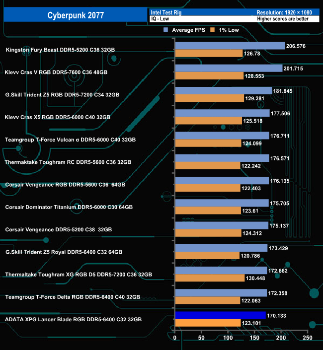 Using the Ultra quality settings the XPG Lancer Blade RGB6400 memory sits in the middle of the results charts. Easing off the quality settings down to the Low setting sees the memory moving up the chart to lie in fourth place. Truth be told there isn't much separating the majority of the modules in these two tests.