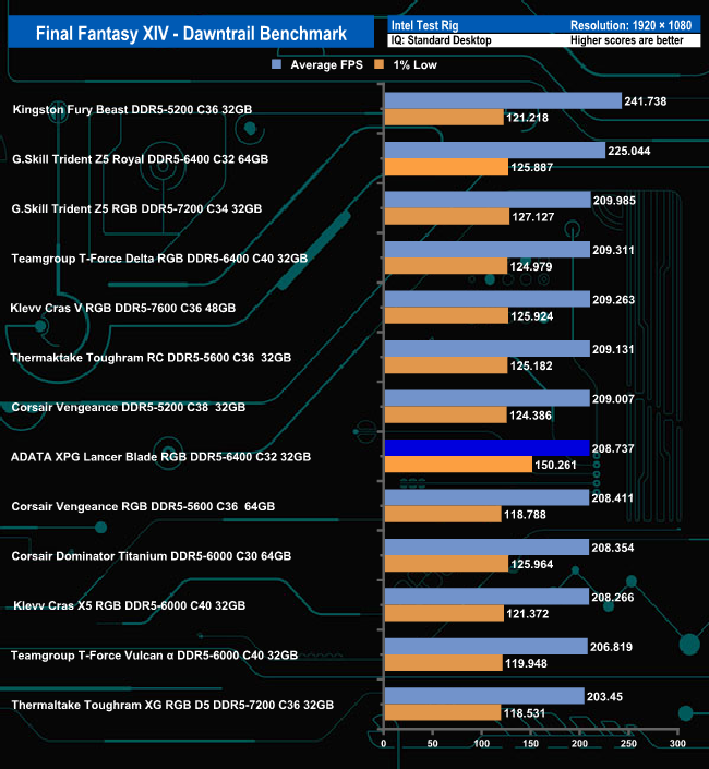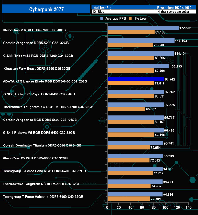 Using the Ultra quality settings the XPG Lancer Blade RGB 6400 memory sits in the penultimate position in the results charts. Switching to the Standard Desktop mode sees the memory moving up a couple of places to sit just behind Corsair's Vengeance RGB 5600 memory.