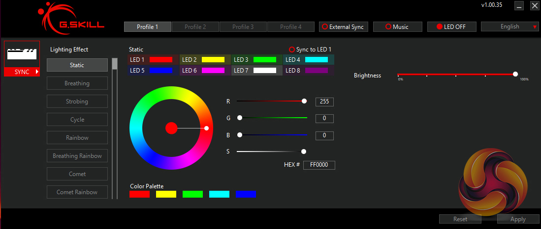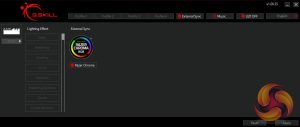 G.Skill's Trident Z lighting control software allows you to set up four profiles independently with their own custom light setup. The modules can be set up together or as individual units. The software has fourteen lighting effects and a wide colour palette to set up your desired effect. And as each module can be set up separately, you can come up with some pretty radical effects. There's also a Music Mode which can be customised, but once enabled, all the other profiles are disabled. However, in this mode, the modules will stay dark if there is no audio output.