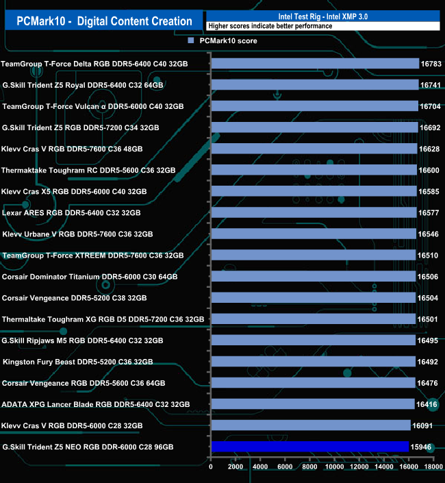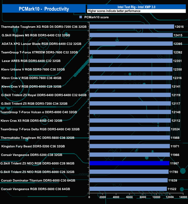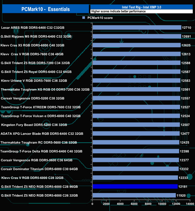 The 96GB kit of G.Skill's Trident Z5 Neo RGB 6000 doesn't seem to handle the PCMark 10 benchmark too well, sitting in last but one place in the Essential and last place in the Digital Content Creation tests. Its hows a small improvement in the Productivity test, where it sits fourth from the bottom of the table.