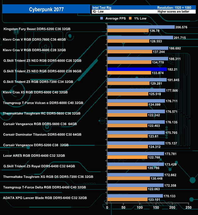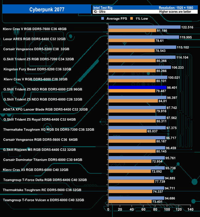 When tested with the Cyberpunk game benchmark under Ultra image quality settings, the drive produced test results of 98.401fps (average), the second fastest we've seen for a G.Skill memory kit, and 79.4871fps (1% Low), which puts the memory in the top half of the results chart. Switching over to the low image quality setting saw the module rise to fifth place on our results chart.