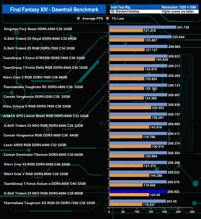 Using the maximum quality settings in the Final Fantasy XIV-Dawntrail benchmark, the memory sits in last but one place – but the margins are very slim. Reducing the quality settings to Standard Desktop results in an obvious increase in frame rate, but unfortunately, the modules remain in the same position in the table.