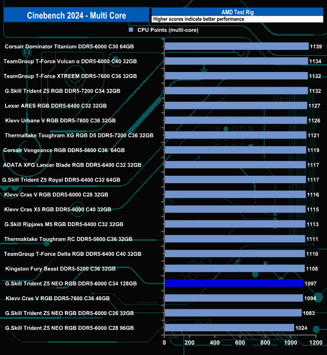 In the Cinebench 2024 multi-core test, G.Skill's Trident Z5 Neo RGB DDR5-6000 C34 128GB kit is in the lower part of the results table, but it is faster than the two other Trident Z5 Neo RGB DDR5-6000 kits we've tested.