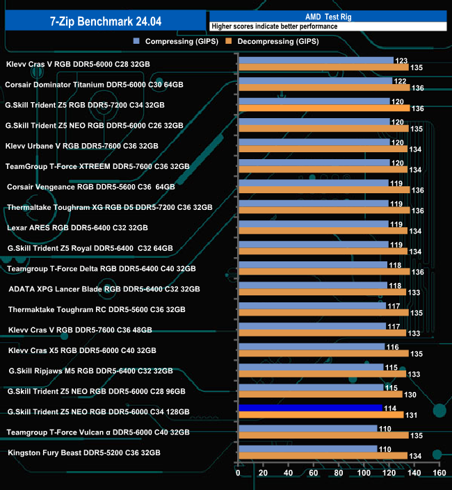 In the 7-Zip benchmark, the 128GB G.Skill Trident Z5 Neo RGB kit sits third from last place in the table.