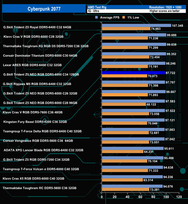 When tested with the Cyberpunk game benchmark using the Ultra settings, the drive produced test results of 97.722fps (average) and 70.073fps (1% Low), which puts the memory in sixth place in the chart.