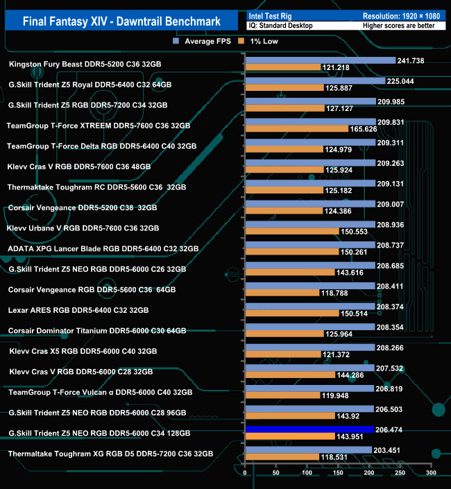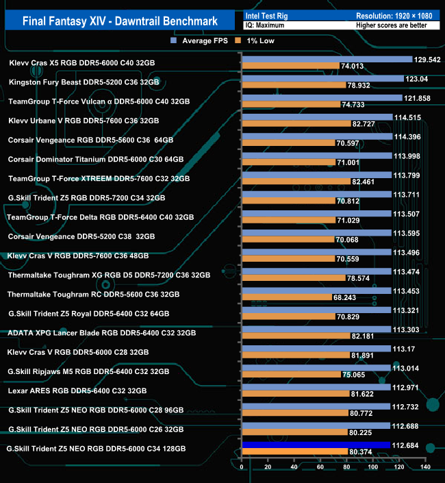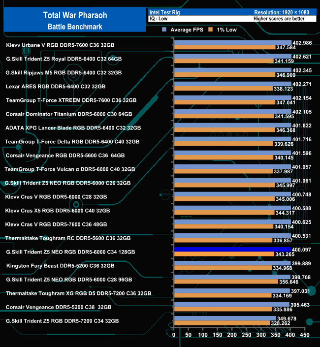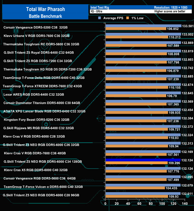 Using the Ultra quality settings, the G.Skill's Trident Z5 Neo RGB DDR5-6000 C34 128GB kit sits in the bottom half of the Total War Pharaoh Battle benchmark, but truth be told, there isn't much separating any of the modules in this test.