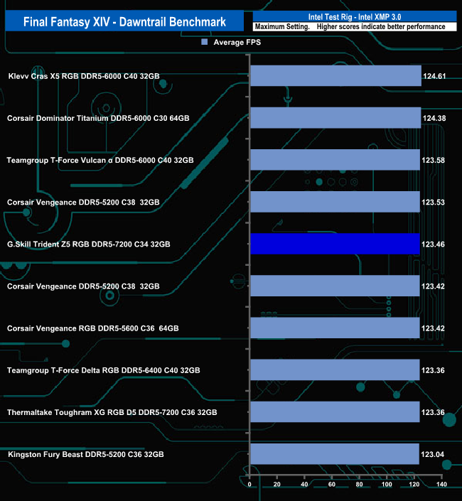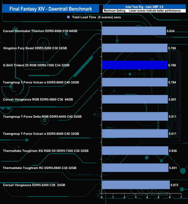 There's not much to choose from between all the sets in the Final Fantasy XIV Dawntrail benchmark regarding fps, but there are more variations in scene load times with the G.Skill Trident Z5 RGB 7200 sitting in third place.