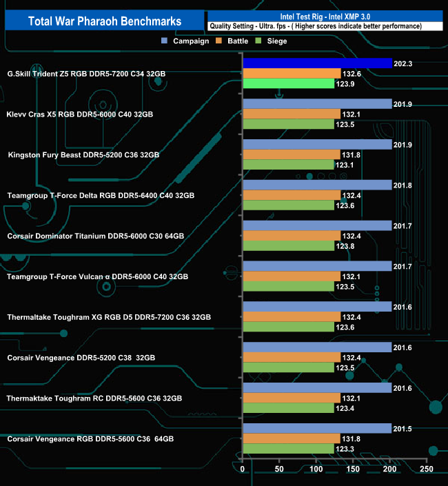 As with the Final Fantasy XIV Dawntrail benchmark, there is no marked difference between any of the modules regarding the three Total War Pharaoh built-in benchmarks.