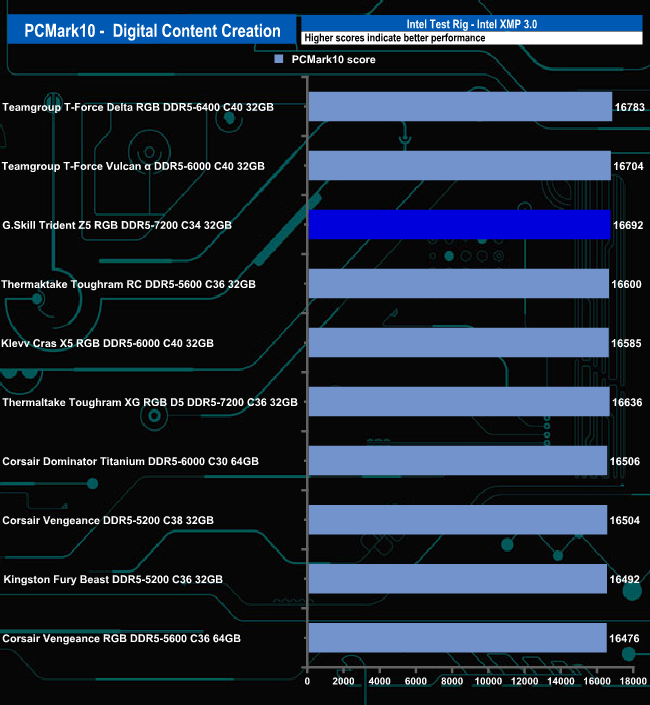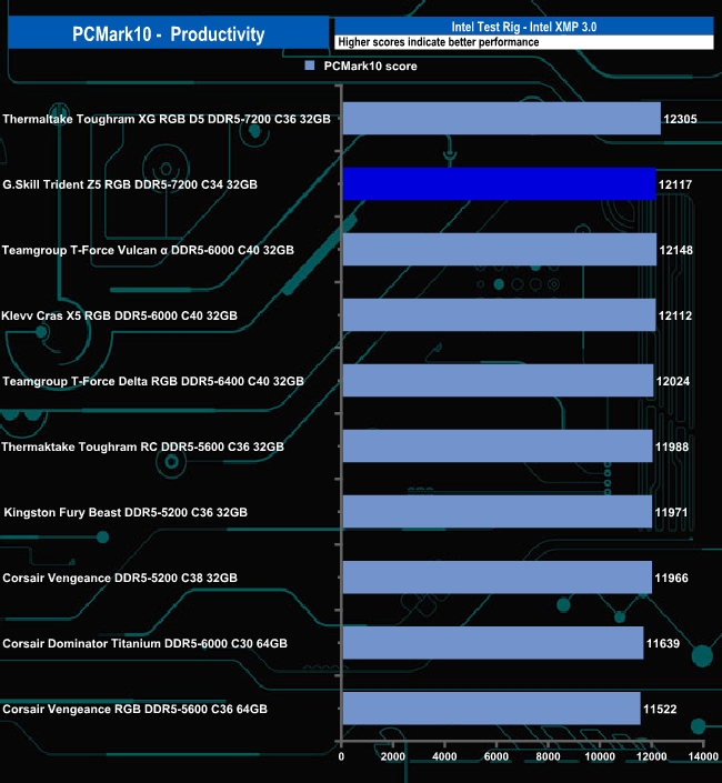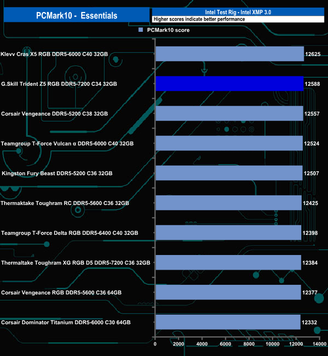 G.Skill's Trident Z5 RGB 7200 memory displays pretty consistent performance in all three parts of the PCMark 10 benchmark.