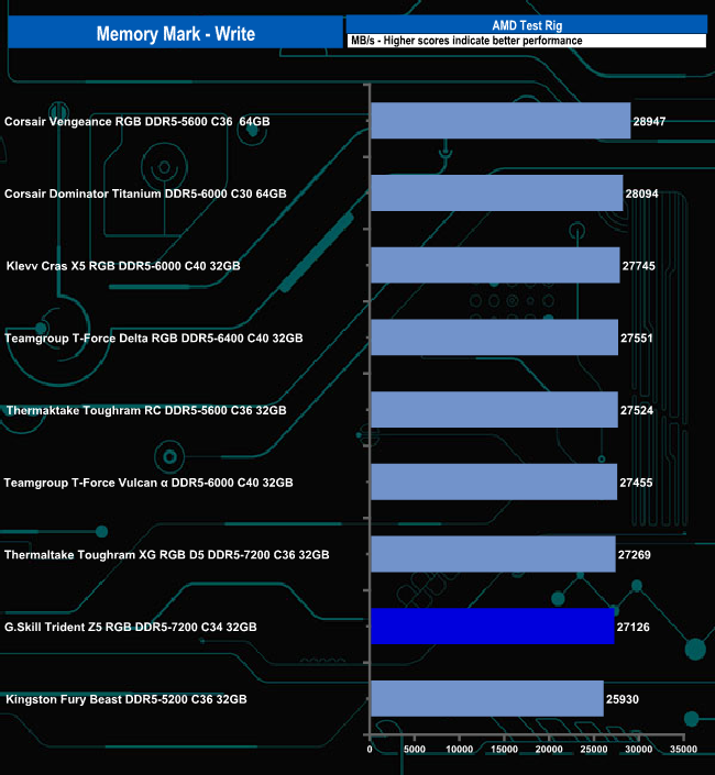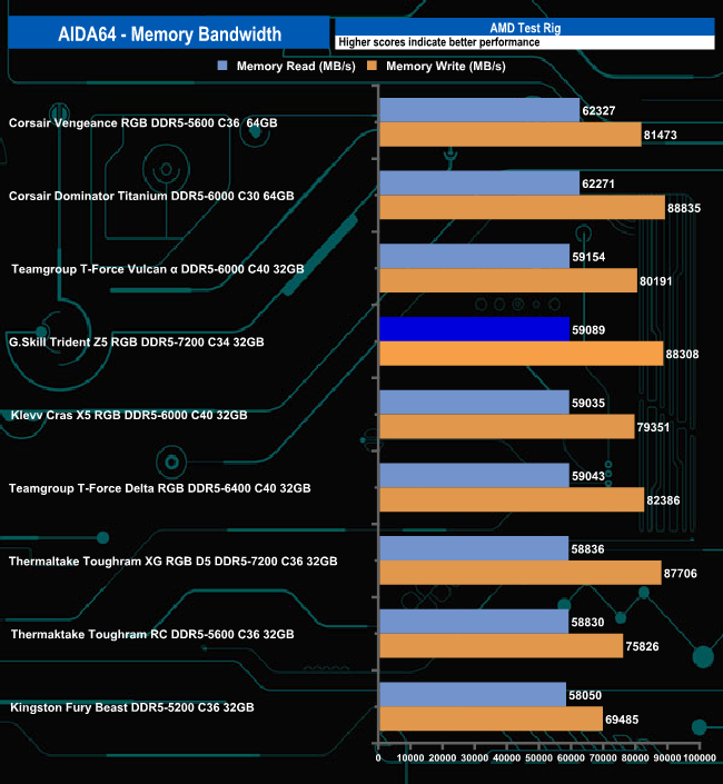 With a read result of 59,089MB/s, the G.Skill Trident Z5 RGB 7200 sits in fourth place in our results graph but its write result of 88,308MB/s is the second fastest of the DDR5 sets tested here behind Corsair's Dominator Titanium 6000.