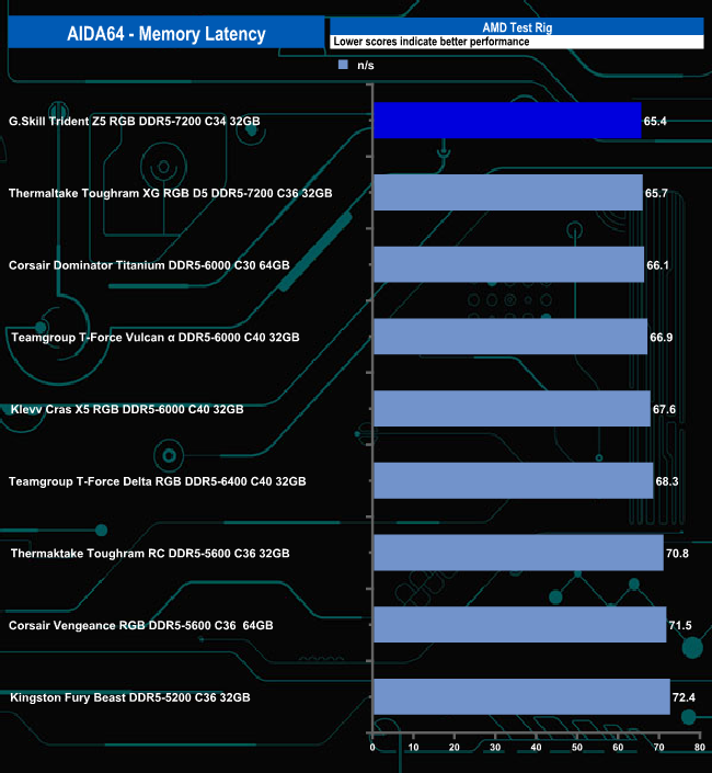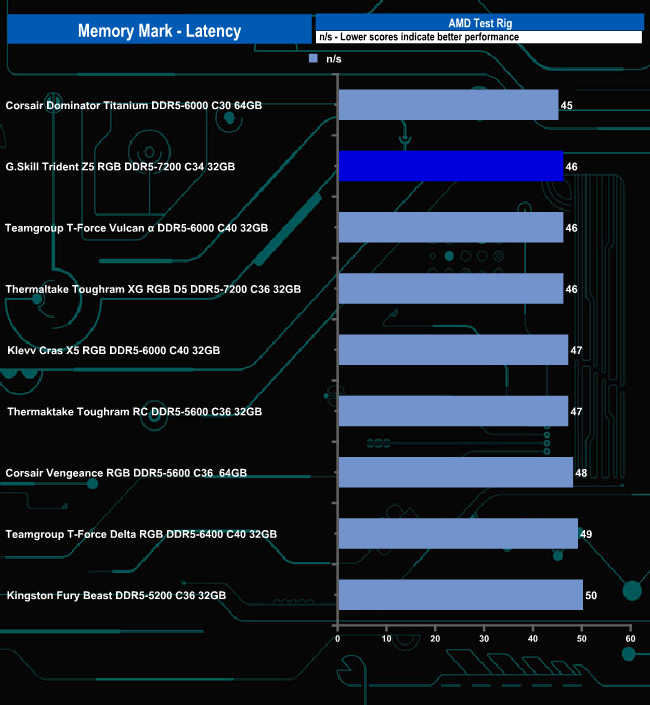 The latency performance of all the tested modules is closely matched with only a 5ns difference between the slowest (Kingston Fury Beast 5200 C36) and the fastest, Corsair's Dominator Titanium 6000 C30.